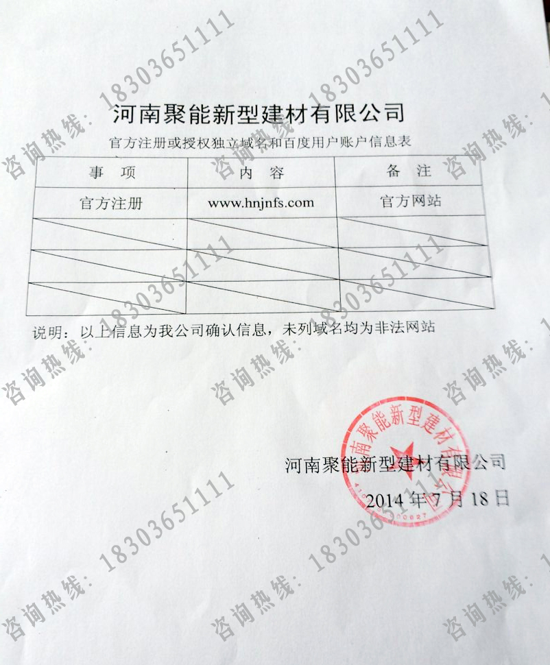 近發(fā)現(xiàn)一些非聚能內(nèi)部人員以我公司名義私自建立網(wǎng)站以及網(wǎng)絡(luò)推廣,在此提醒各位:咨詢請(qǐng)謹(jǐn)慎,購(gòu)買我公司產(chǎn)品更是謹(jǐn)慎,認(rèn)準(zhǔn)河南聚能新型建材有限公司唯一官方網(wǎng)站:http://m.searchdotnetnuke.com